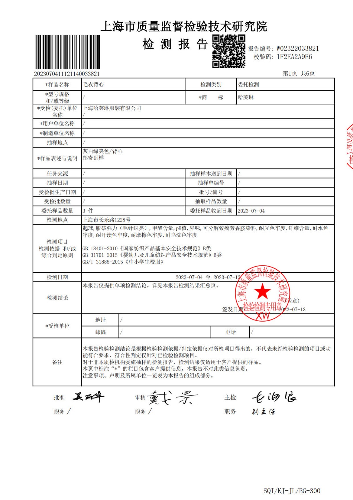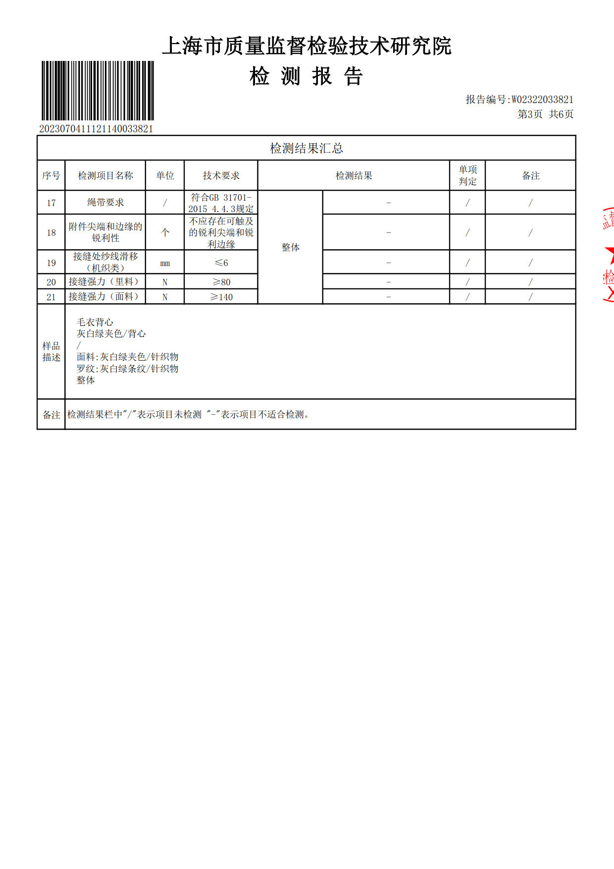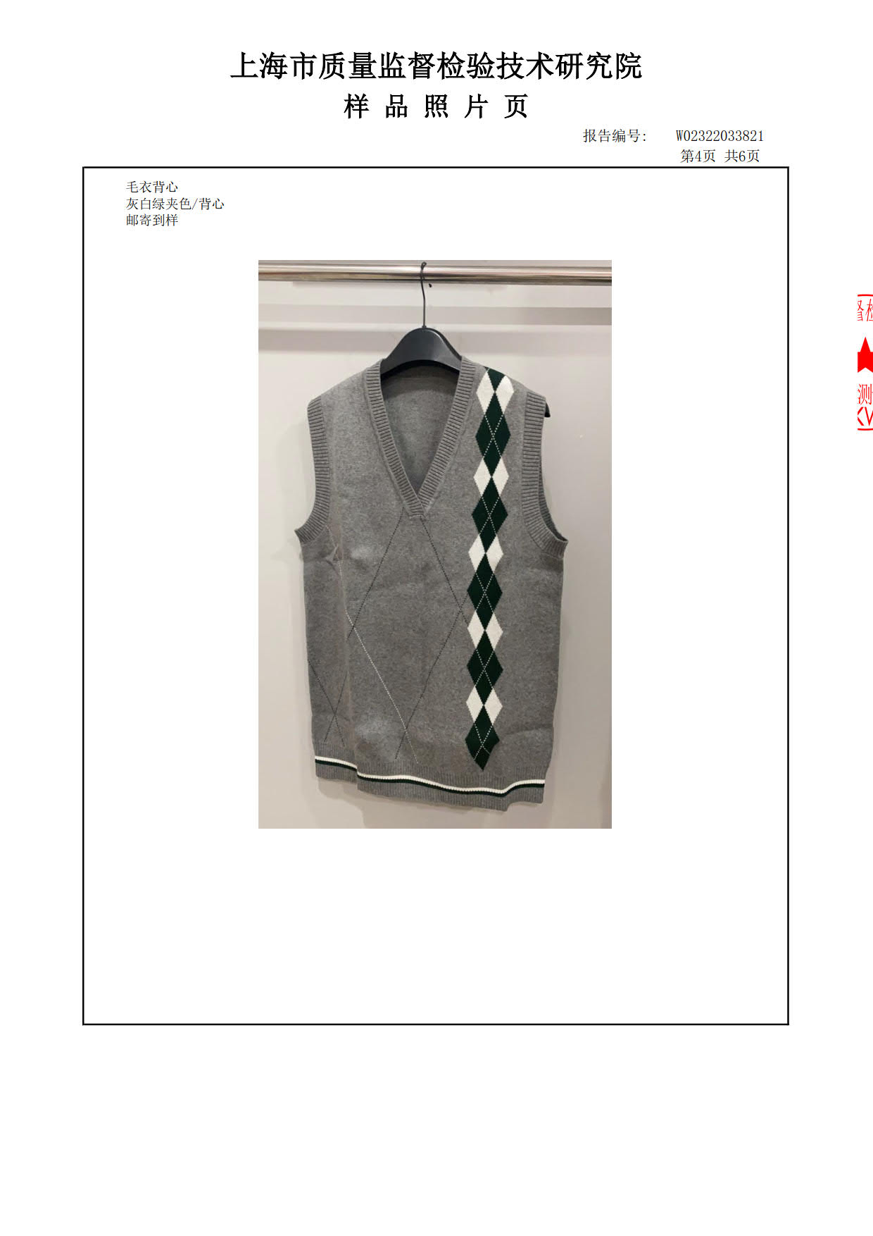 2023年9月学生校服(灰色墨绿白色纱线背心线衫)质检报告