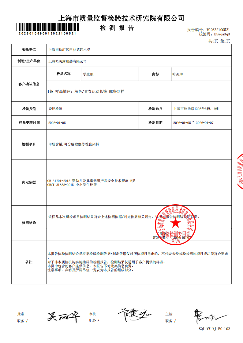 2026年1月学生校服(运动套装)第二次质检报告