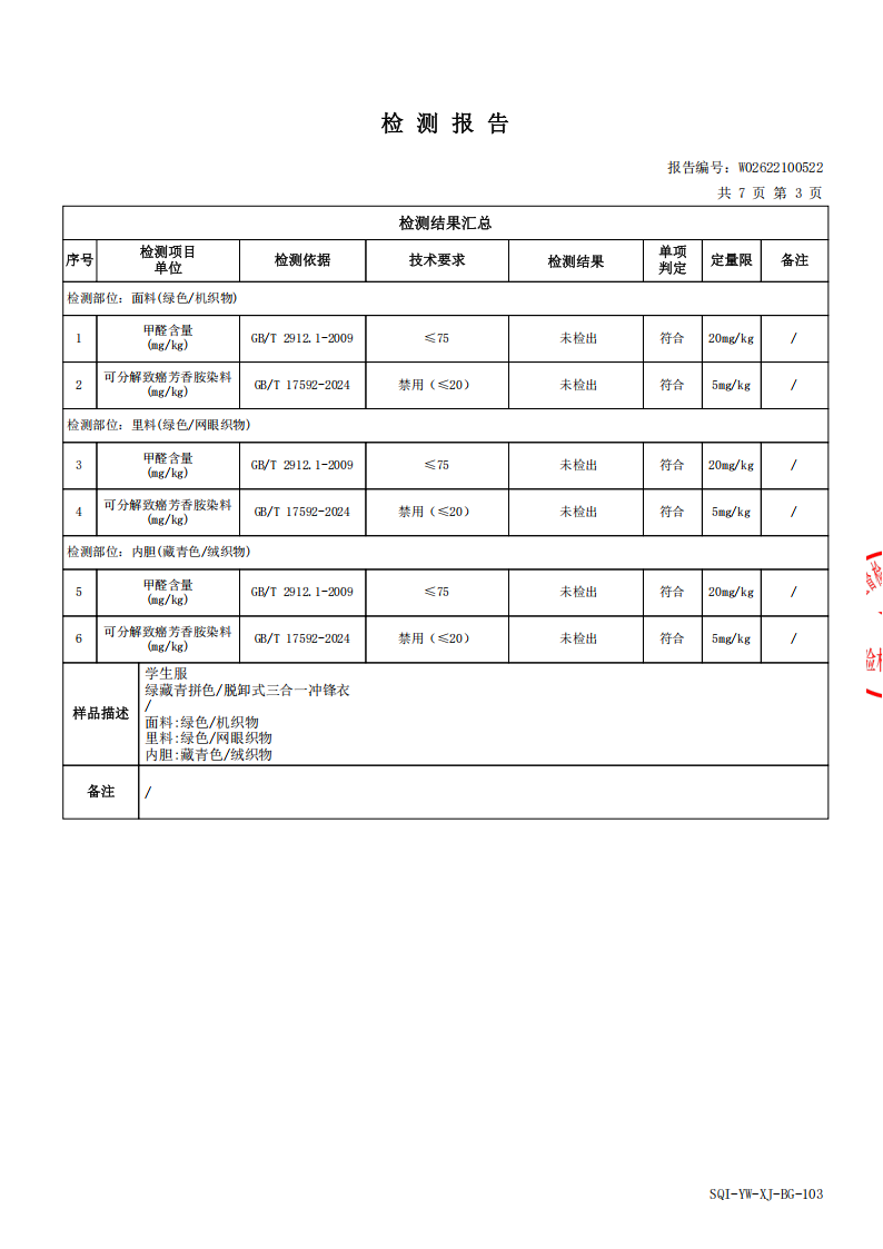 2024年10月学生校服(冬装)质检报告
